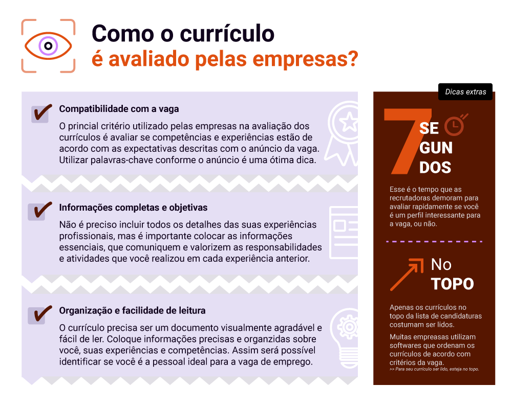 Um currículo é avaliado em 7 segundo, segundo um dado levantado pela empresa americana Ladders. Ou seja, quem está recrutando faz uma leitura dinâmica extremamente rápida e logo já tem um julgamento inicial sobre o perfil profissional ser ou não ideal para a vaga. Por isso, é preciso fazer o currículo de forma com estratégia e cuidado, assim suas chances de ser chamada para uma entrevista são maiores.