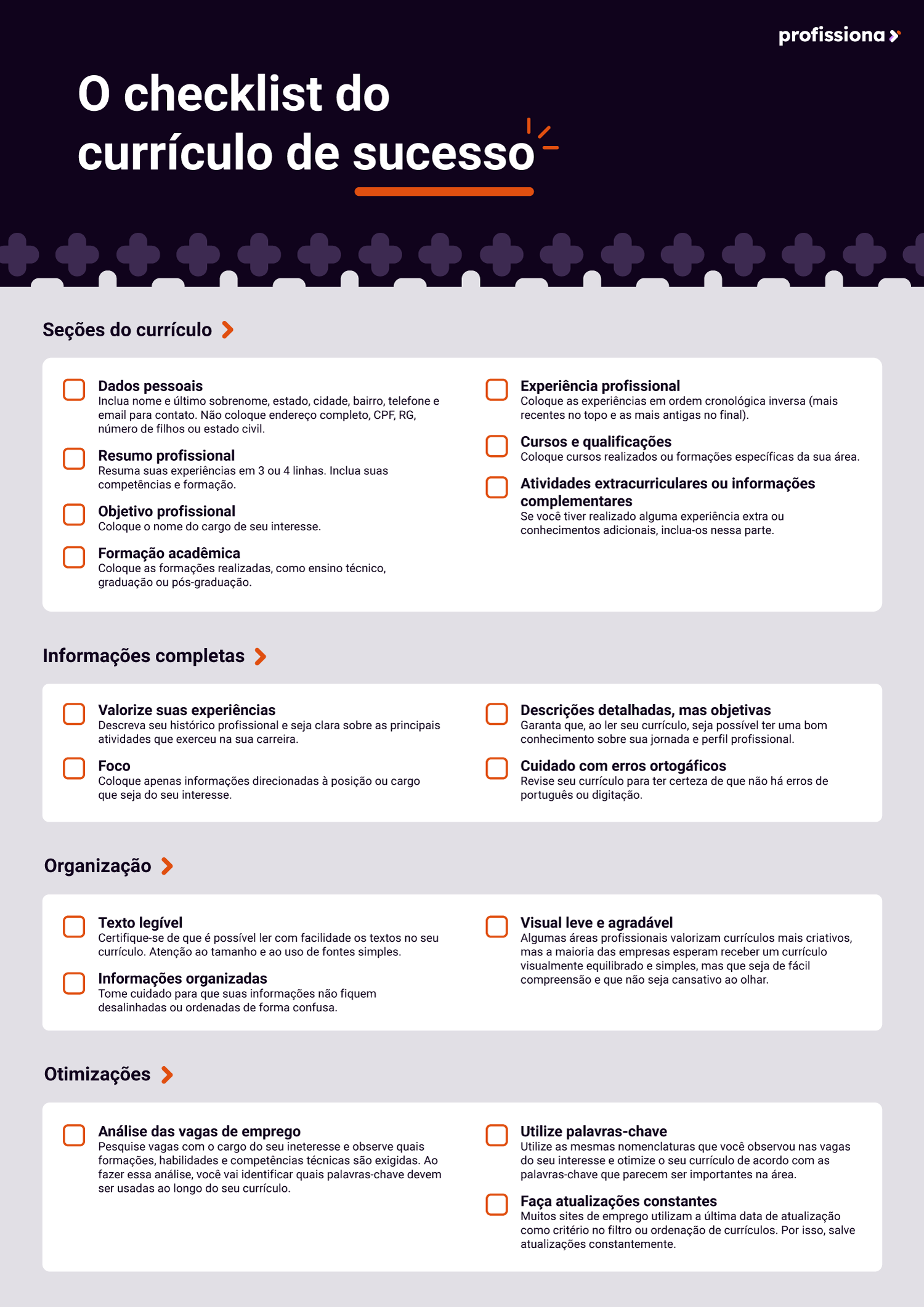 Seja clara e objetiva em suas descrições. Então evite frases longas e complicadas. Use bullet points para listar responsabilidades e conquistas, facilitando a leitura e a compreensão rápida de suas habilidades e experiências.